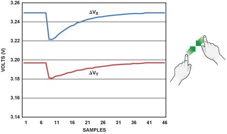 圖 3 顯示了一個(gè)沿著垂直(Y)軸捏合的例子。當(dāng)手勢(shì)開始時(shí),其中一層的兩根電極之間的電壓恒定不變,另一層則表現(xiàn)出階躍性降低,然后隨著手指相互靠近而提高。