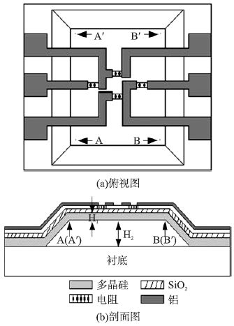 犧牲層結構壓力傳感器是指彈性膜片利用犧牲層技術制作而成的壓力傳感器,結構示意圖如圖1所示,其中AB( A''B'') 為膜片寬度a,AA''( BB'') 為膜片長度b,H1為膜片厚度,H2為犧牲層厚度。