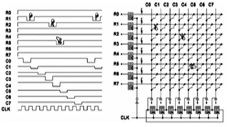 如圖8 所示,8×8 數(shù)字電阻觸摸屏, 基于Altera 解決方案[1]:它采用兩層ITO 分別作為水平的sensing line(觸摸感測線)和垂直的driving line(加電驅(qū)動線),driving line 和sensing line 之間的觸點就相當(dāng)于一個開關(guān),在未接觸時,它們之間是絕緣的,而接觸發(fā)生后,兩者發(fā)生短路,相當(dāng)于開關(guān)閉合。驅(qū)動的時候,其中sensing line 通常由一個上拉電阻施加高電平,同時在driving line 上以一定頻率依次在各列中施加負脈沖電壓,這樣當(dāng)掃描到觸點所在的那一列時,由于觸點開關(guān)閉合,形成直流通路,使得觸點所在行的電壓被拉低,形成一個負脈沖,這樣就檢測到了觸點的位置。由于driving line 是依次掃描,所以可以檢測到多個觸點的位置。