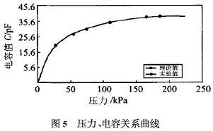 1可見,擬合的電容誤差小于1%。由此可見,在不同的時刻測得UO(t),通過曲線擬合得出參數(shù)RC。再給電路加小信號直流電源,測出R值,即求得C,通過C值則可知被測環(huán)境的壓力。圖5為350℃時,不同的壓力所對應(yīng)的電容的理論值和實驗值,從實驗數(shù)據(jù)(表2)可得,在測壓的過程中,利用模型識別的方法,誤差較小,其測壓誤差小于2%。