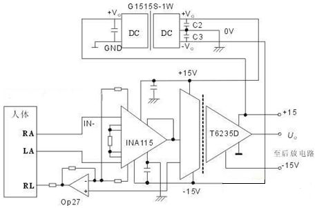 以上電路是由漢為公司的T6235D與INA 115等組成的隔離型心電檢測(cè)前置放大電路,該電路由于其具有輸入阻抗高、漏電流小、檢測(cè)精度高和滿足人體安全等指標(biāo)完全可以達(dá)到醫(yī)療器械使用的要求標(biāo)準(zhǔn)。該電路一般作為前置放大電路,器件直接與人體接觸,并拾取心電信號(hào)后通過(guò)INA115進(jìn)行放大,最后由ISO122隔離傳輸?shù)胶笾梅糯箅娐?,?shí)現(xiàn)人體信號(hào)與輸出及電源的隔離放大。