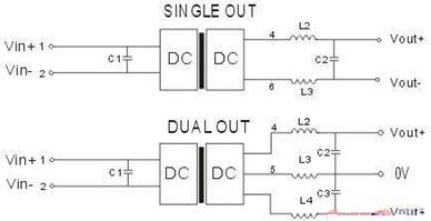 3、 由于DC/DC電源模塊是采用開(kāi)關(guān)振蕩電路來(lái)實(shí)現(xiàn)的,其自身也會(huì)產(chǎn)生共模、差模噪聲的干擾,對(duì)于對(duì)紋波噪聲要求較高的場(chǎng)合可在DC/DC電源模塊的輸出端外接無(wú)源LC濾波網(wǎng)絡(luò)或RC(損耗較大),以進(jìn)一步降低電源紋波噪聲,但是要注意L自身諧振頻率要遠(yuǎn)高于模塊的開(kāi)關(guān)頻率,允許通過(guò)的電流值最好在模塊輸入電流的兩倍以上,內(nèi)阻要小,以降低直流損耗。具體可參考下圖: