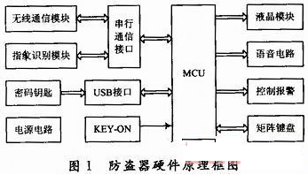 主要工作原理如下:車主停車熄火后,防盜器進入鎖定狀態(tài)。此時如果汽車鑰匙不在ON位,就不能進行指紋識別;只有當汽車鑰匙在ON位,才可用指紋識別解鎖防盜器并自動點火。在鎖定狀態(tài)下,汽車的油路、電路等被切斷,汽車鑰匙無法點火;如果強行剪斷指紋采集模塊和控制盒的連線,或者不識別指紋而強行用汽車鑰匙點火,汽車會通過鳴號、閃燈和無線通信網(wǎng)絡報警。在鎖定狀態(tài)插入密碼鑰匙可進入解鎖狀態(tài),并可根據(jù)LCD和語音提示通過小鍵盤進行指紋注冊/刪除、手機號碼設置和應急點火等操作。