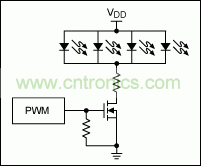 許多顯示屏模塊如今都配有一個集成控制器,用戶可以通過向控制器發(fā)送串行命令,直接設(shè)置背光亮度。如果顯示屏模塊未配備集成控制器,還可安裝一個簡單的背光控制執(zhí)行器,控制顯示屏后面用于背光照明的白光LED燈的輸入電流。實(shí)現(xiàn)這種控制的一種簡單辦法是:直接給LED串聯(lián)一個場效應(yīng)晶體管(FET),使用PWM信號快速打開、關(guān)閉FET (圖5)。然而,也可以利用單一芯片(用于LED控制的MAX1698升壓轉(zhuǎn)換器)準(zhǔn)確、可靠地調(diào)節(jié)(圖6),請參考應(yīng)用筆記3866“Low-power PWM output controls LED brightness”,獲取詳細(xì)信息。