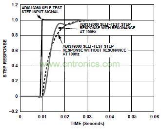 確定傳感器步進(jìn)響應(yīng)對(duì)于隔離在確定帶寬特性時(shí)觀察到的諧振條件很有用。圖1所示為一種采用ADIS16080的系統(tǒng)的頻率響應(yīng)。圖中所示諧振頻率為100 Hz。開始時(shí),該諧振到底是傳感器行為導(dǎo)致,還是系統(tǒng)中的機(jī)械諧振所導(dǎo)致,這并不清楚。幸運(yùn)的是,步進(jìn)響應(yīng)(如自測(cè)功能所確定)可以區(qū)分這兩種效應(yīng)。圖2顯示了兩種條件下的坐標(biāo)曲線圖:測(cè)試設(shè)置導(dǎo)致的諧振和傳感器本身導(dǎo)致的諧振。