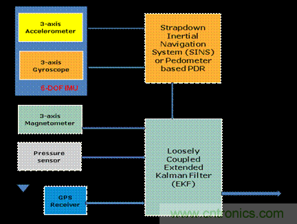 圖4所示是PNS或PDR的結(jié)構(gòu)示意圖。從傳感器角度看,該系統(tǒng)包括一個3軸加速度計、一個3軸陀螺儀、一個3軸磁力計和一個壓力傳感器。此外,在這個示意圖內(nèi)還有一個GPS接收器和一個主處理器。主處理器用于采集傳感器數(shù)據(jù),運行航位推測算法和卡爾曼濾波算法