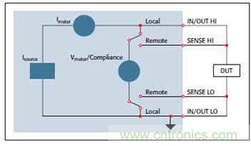 圖2:SMU儀器作為恒流源和伏特計(jì)的配置,用于測(cè)量DUT的響應(yīng)