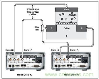 圖10:測(cè)試三端BioFET時(shí)兩部2450型儀器配置