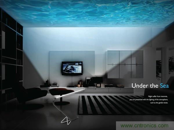 Under The Sea的設(shè)計(jì)理念,正式希望通過燈光營造一種奇妙的氛圍,幫助你快速進(jìn)入睡眠。當(dāng)Under The Sea燈頭朝向天花板時(shí),它可投射出蔚藍(lán)平靜的海面,讓我們仿佛置身于海中。而當(dāng)Under The Sea燈頭朝下時(shí),它又重新回歸正常工作狀態(tài),正常的柔和燈光讓你學(xué)習(xí)、工作、閱讀都進(jìn)行的輕松愜意。