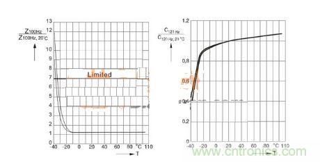 在鋁電解高壓電容器的正常運行過程中,其本身的電解液導電性,將會隨著環(huán)境溫度的降低而降低,從而會導致電解液阻抗的增加,阻抗和損耗角正切也會因此而增大。在絕大多數(shù)應用中,相應增加僅允許到某最大值。在這里需要強調(diào)的一點是,低于上述溫度限值的工作并不會損壞高壓電容,僅僅只是會影響其使用壽命,尤其是當紋波電流流經(jīng)器件時,由于增加ESR而產(chǎn)生的熱量耗散會提高電容器溫度,使其遠大于環(huán)境溫度,使電容可維持設(shè)備運行。下圖所示為下限類別溫度為-25℃電容器的阻抗和電容典型值。