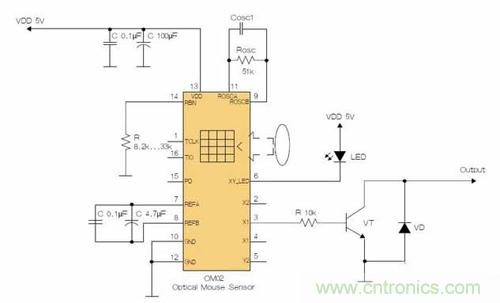 鼠標(biāo)芯片的CMOS光學(xué)傳感器可提供非機(jī)械式跟蹤引擎。在該芯片內(nèi)部可完成圖像的捕獲、數(shù)字化和數(shù)字處理。就拿簡單且低成本的OM02來說,該傳感器通過采集表面圖像幀來測量位置,并通過數(shù)學(xué)運算判定運動方向和距離。該傳感器安裝聚苯乙烯光學(xué)封裝中,設(shè)計用來與高亮度LED一起使用。它有一個完整且緊湊的跟蹤引擎;沒有活動部件,也不要求精密的光學(xué)對準(zhǔn)。OM02可以為X和Y方向運動產(chǎn)生正交輸出信號。分辨率約為0.0025英寸,運動速度最高為每秒16英寸。