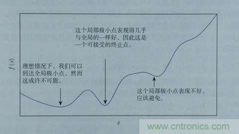 這樣,斜率為0時我們其實就得到了函數(shù)f在該點可以得到最小值。那么,把x向左或者向右移一點,到底移多少呢?如果移多了,可能移過了,如果移得很少,則可能要移很久才能找到最小點。還有一個問題,如果f(x)操作函數(shù)有多個局部最小點、全局最小點時,如果x移的非常小,則可能導致通過導數(shù)只能找到某個并不足夠小的局部最小點。如下圖所示: