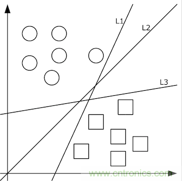 上圖中的二維數(shù)據(jù)x只有方形和圓形兩個類別y,很好分,我們需要學習的分類函數(shù)用最簡單的f(x,y)=ax+by+c就能表示出分類直線。例如f(x,y)大于0時表示圓形,小于0時表示方形。