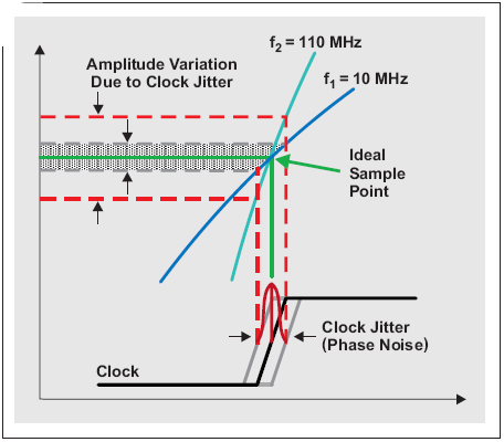 仔細觀察某個采樣點,可以看到計時不準(時鐘抖動或時鐘相位噪聲)是如何形成振幅變化的。由于高 Nyquist 區(qū)域(例如,f1 = 10 MHz 到 f2 = 110 MHz)欠采樣帶來輸入頻率的增加,固定數(shù)量的時鐘抖動自理想采樣點產(chǎn)生更大數(shù)量的振幅偏差(噪聲)。另外,圖 2 表明時鐘信號自身轉(zhuǎn)換速率對采樣時間的變化產(chǎn)生了影響。轉(zhuǎn)換速率決定了時鐘信號通過零交叉點的快慢。換句話說,轉(zhuǎn)換速率直接影響 ADC 中時鐘電路的觸發(fā)閾值。
